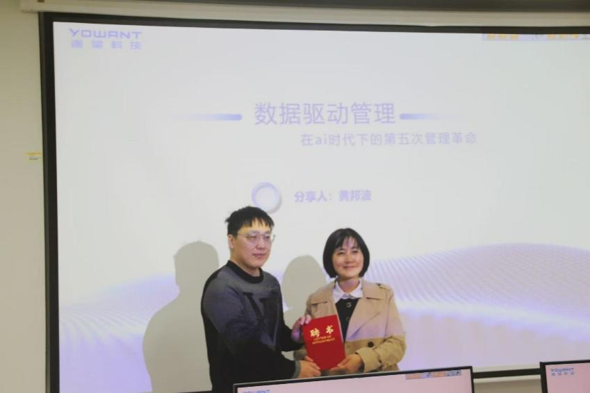 实验室揭牌仪式后,遥望科技技术总监黄邦波以《数据驱动管理——在AI时代下的第五次管理革命》为题,围绕遥望科技的发展历程、数字化到智能治理、复杂任务处理AI框架、业务场景落地等内容为在场师生带来干货满满的数字科技专题讲座。学院副院长朱凌为黄邦波颁发共享导师证书。