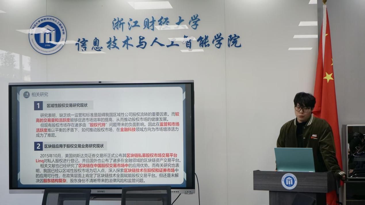郑淇瑜同学以《基于区块链的区域性股权交易模型设计》为题,设计基于区块链的区域性股权交易的四层授权持股与三权分离架构,并提出授权粒度的概念。