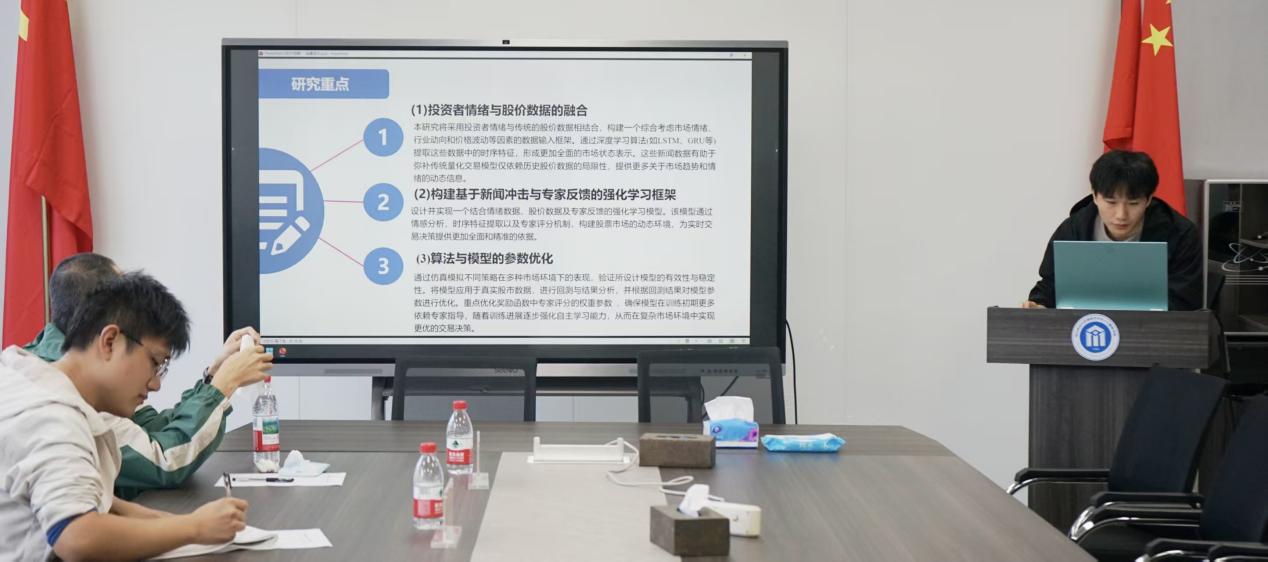2025年11月14日,信息技术与人工智能学院在9-404教室顺利举办了2025年第4期(总第27期)“数智钱潮”研究生论坛。本期论坛由学术部同学主持,邀请了刘东威博士、胡扬帆博士担任点评专家,吸引了众多研究生积极参与和热烈交流。论坛共有6名研究生进行学术汇报,内容涵盖量化交易策略、股权交易模型、助播影响、光伏面板缺陷检测、多传感器系统等多个前沿研究方向。