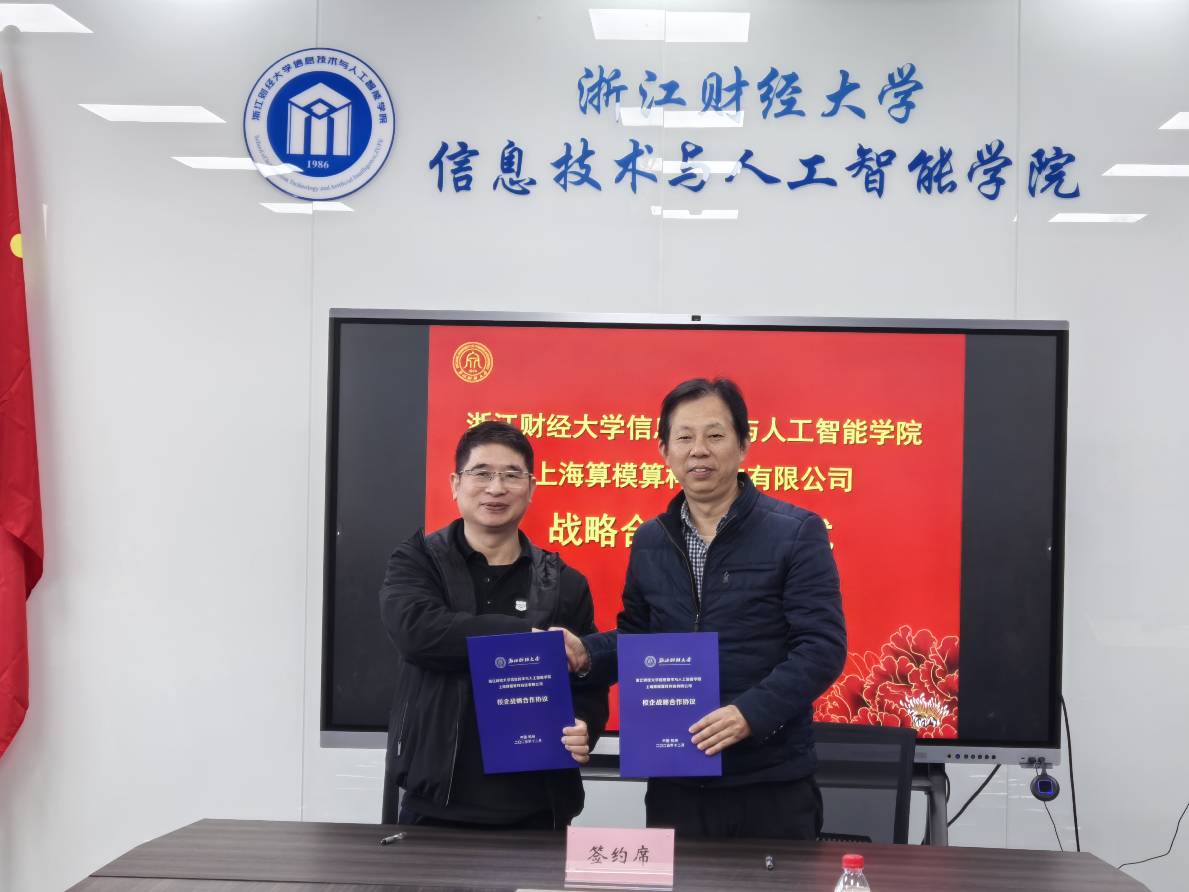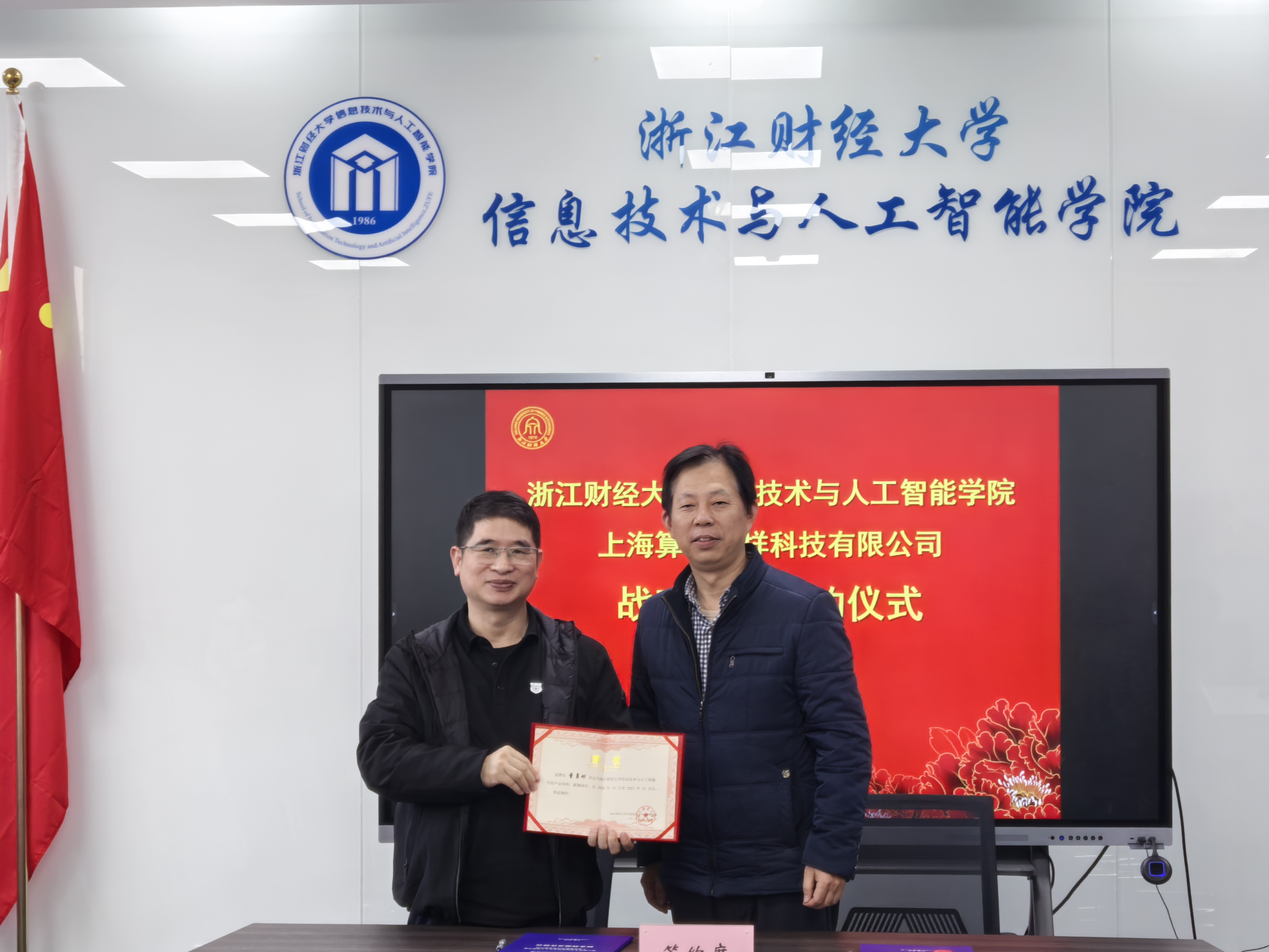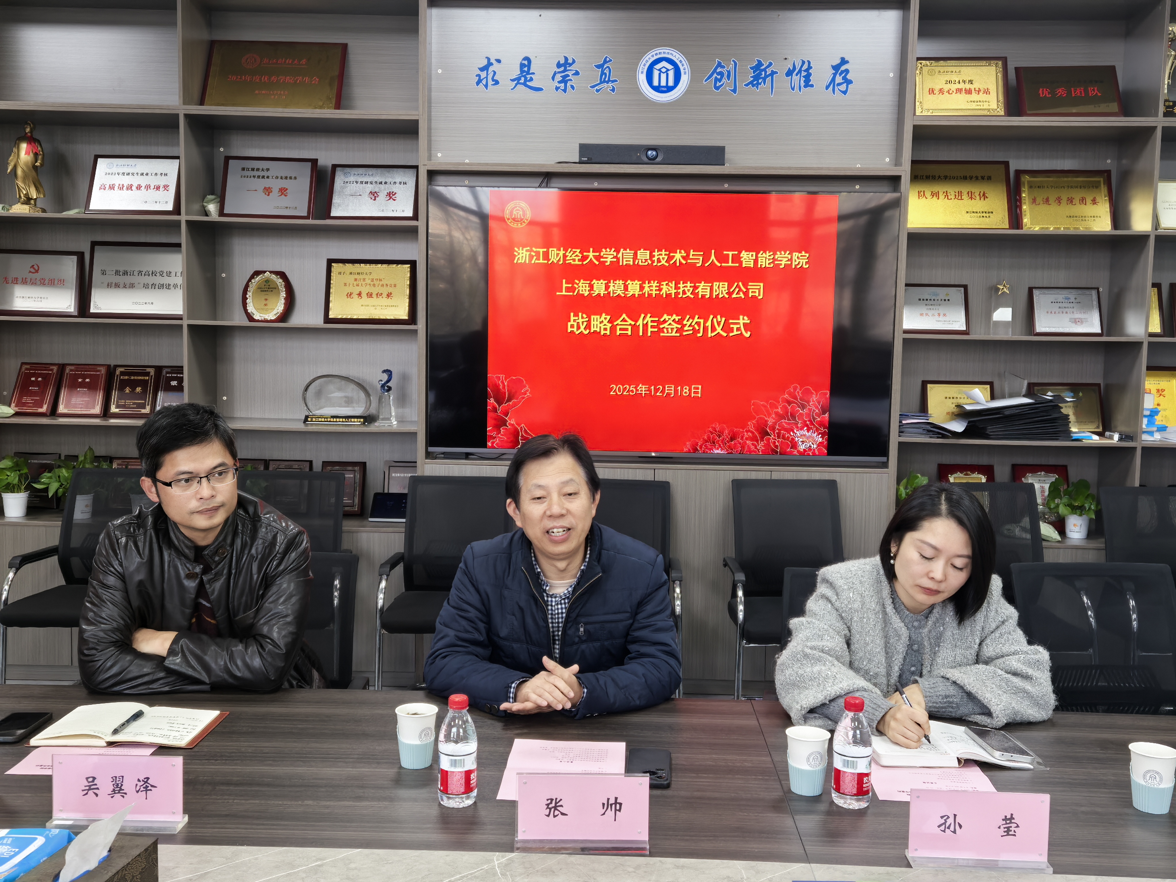 12月18日,浙江财经大学信息技术与人工智能学院与上海算模算样科技有限公司战略合作签约暨“产业导师”聘任仪式顺利举行。上海算模算样科技有限公司董事长董勇刚等一行,96届校友陈三春,学校社会合作处处长孙莹、信息技术与人工智能学院院长张帅、党委书记吴翼泽、校友联络员徐军军及学生代表出席签约仪式。仪式由吴翼泽书记主持。