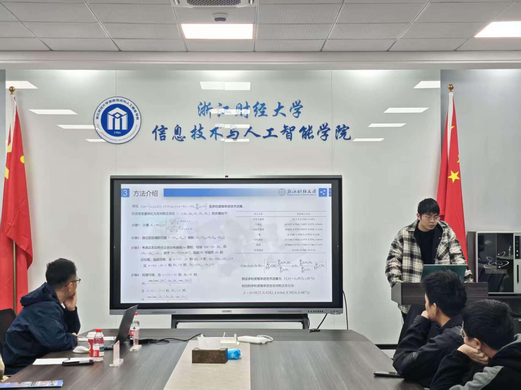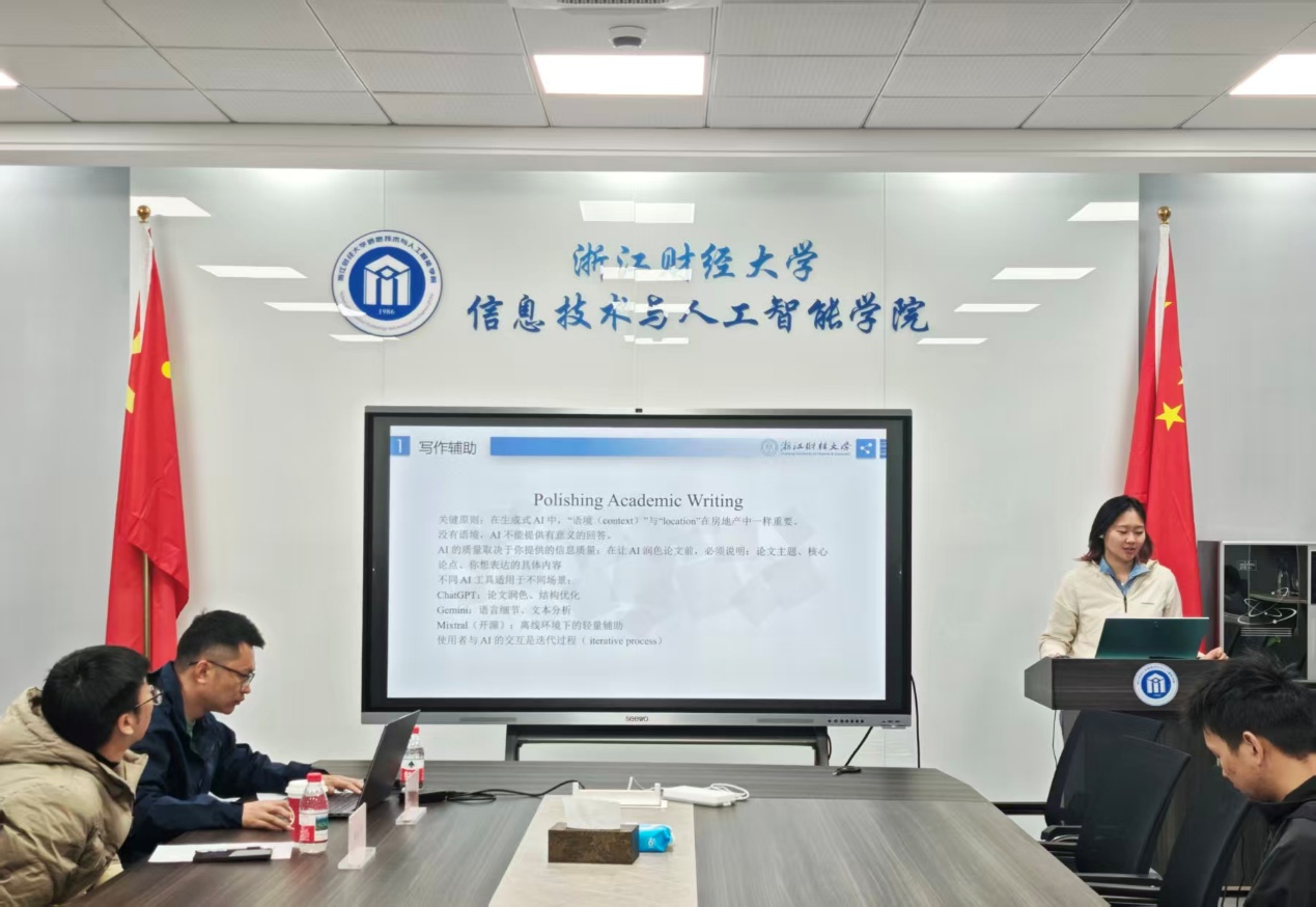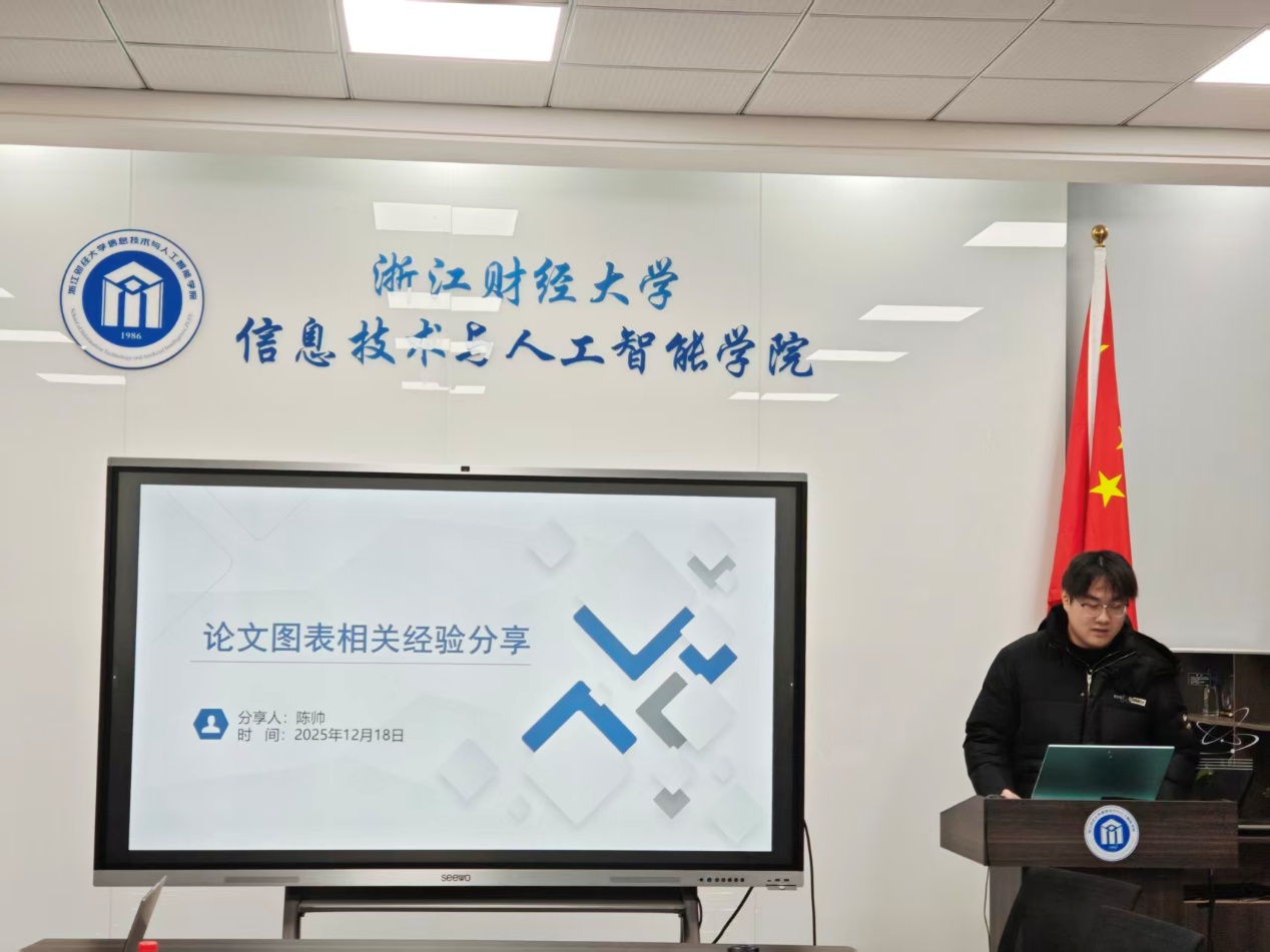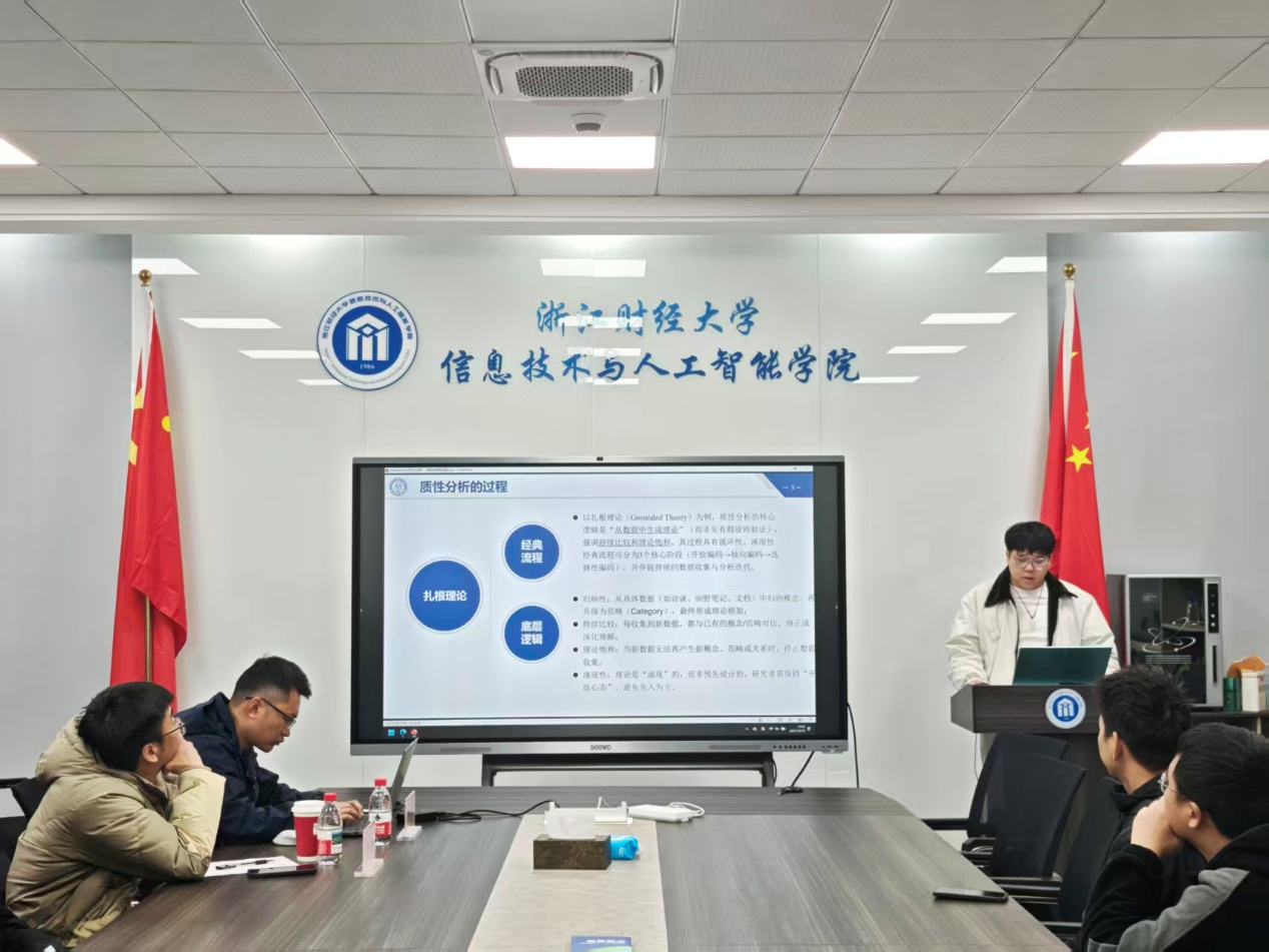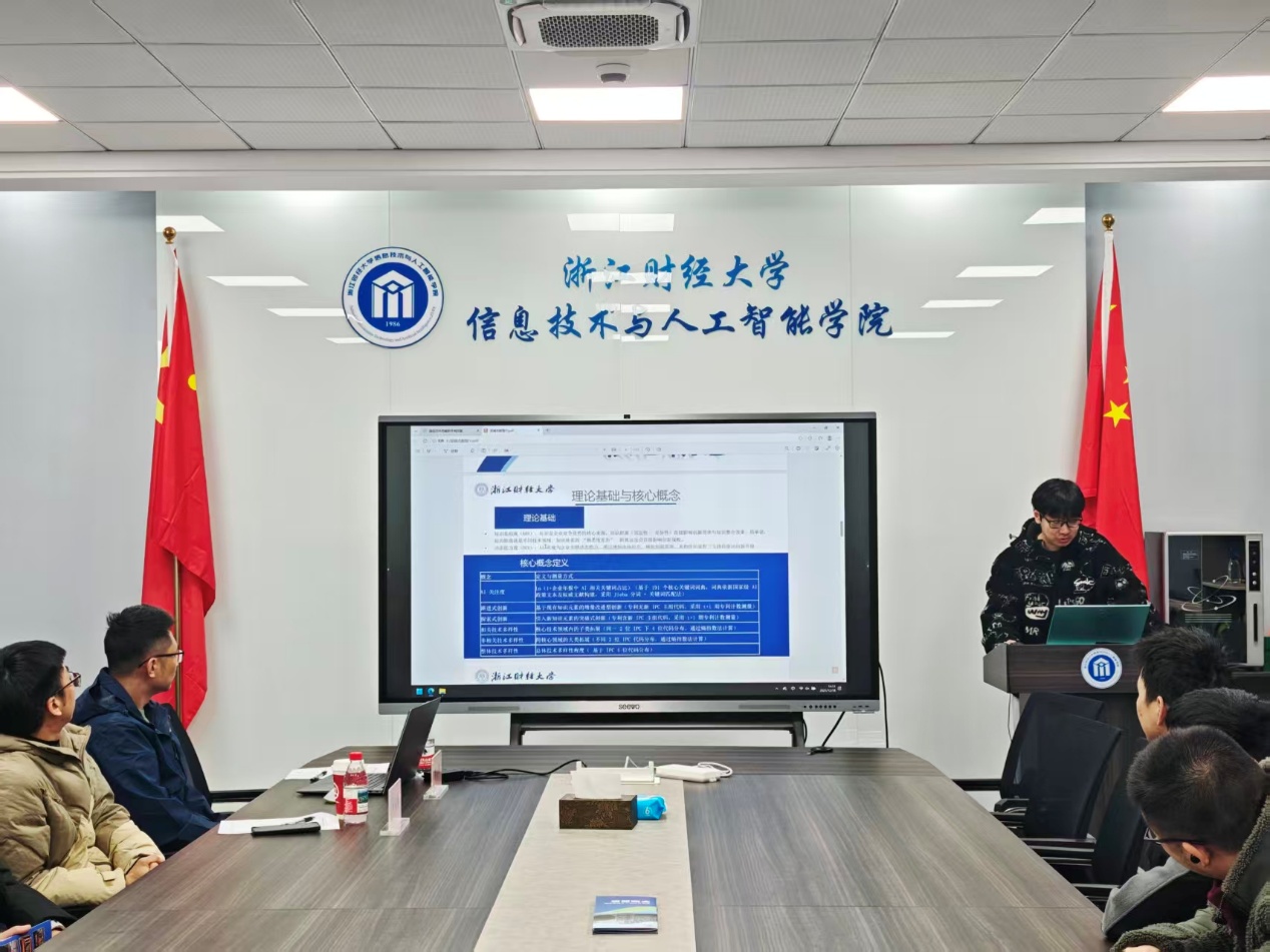 2025年12月18日,信息技术与人工智能学院在9-404教室顺利举办了2025年第5期(总第28期)“数智钱潮”研究生论坛。本期论坛由学术部同学主持,邀请了涂乐博士、陈勇博士担任点评专家,吸引了众多研究生积极参与和热烈交流。论坛共有6名研究生进行学术汇报,内容涵盖论文图表经验分享、流水车间成组调度问题、扎根理论、在线协诊三边匹配决策方法、AI协助写作、技术多样性的调节效应研究等多个前沿研究方向。