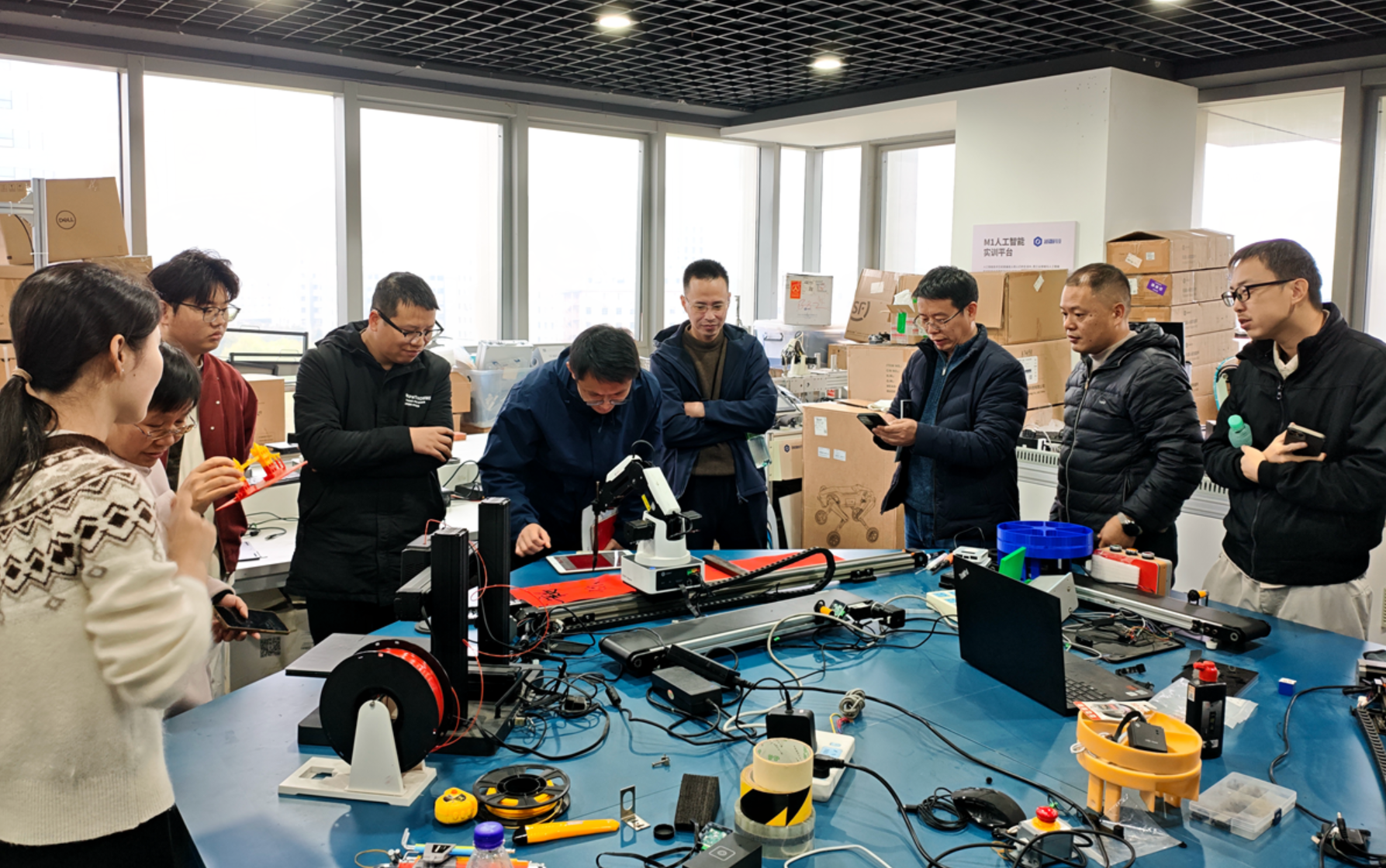 调研组一行受到越疆机器人杭州分中心热情接待。座谈交流中,企业工程师张工系统介绍了越疆机器人的发展历程、核心产品矩阵及产业布局,重点围绕具身智能教学场景,详细阐述了高校人才培养方案设计、课程体系建设、实验教学平台搭建及科研生态构建的思路与举措。结合国内多所院校合作案例,张工展示了越疆在推动机器人技术与人工智能教育深度融合中的实践成果,为调研组提供了可借鉴的宝贵经验。