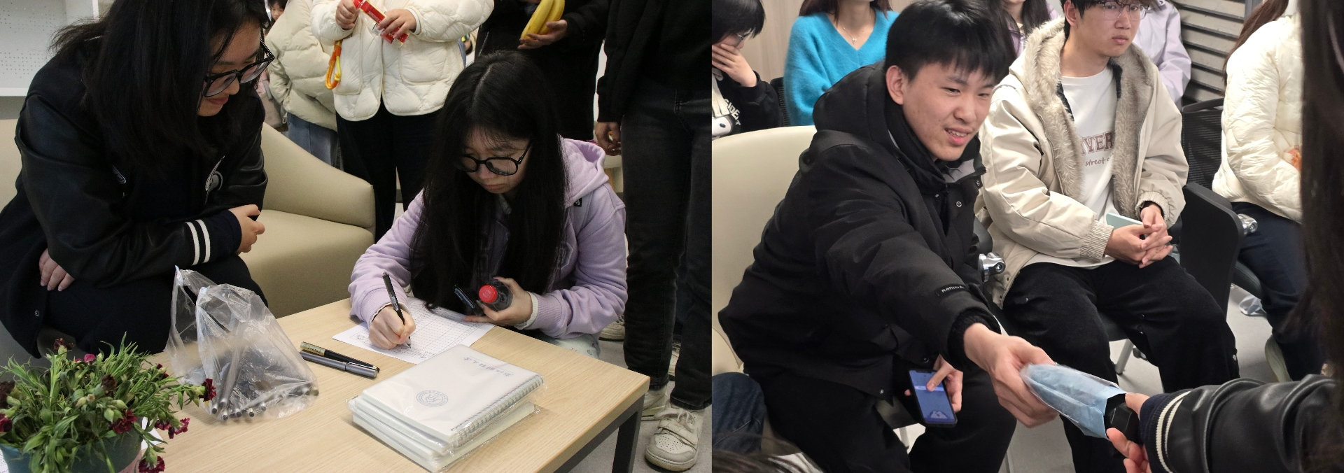 在自由交流互动环节,本科生和研究生围绕科研入门、学业发展、升学选择与职业规划等话题踊跃提问,董起豪博士逐一进行了细致解答。现场讨论深入充分,气氛热烈融洽,进一步拉近了师生之间的交流距离,也为同学们提供了更加清晰的发展思路。同时,给提问的同学准备了互动奖品(文创雨伞、笔记本等)。