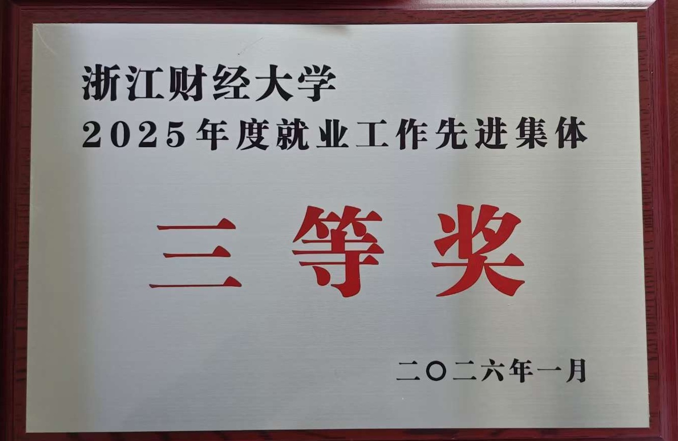 近日,浙江财经大学2025 年度就业工作表彰名单正式公布,我院凭借扎实的就业工作基础、贴合学科特色的育人实践、毕业生高质量就业的突出成效,成功获评浙江财经大学2025 年度就业工作先进集体三等奖。这份荣誉,是学校对我院就业工作的高度认可,更是全院师生勠力同心、协同攻坚的成果结晶,彰显了我院在学校“新财经战略” 引领下,深耕人才培养、护航学子就业、服务发展大局的责任与担当。