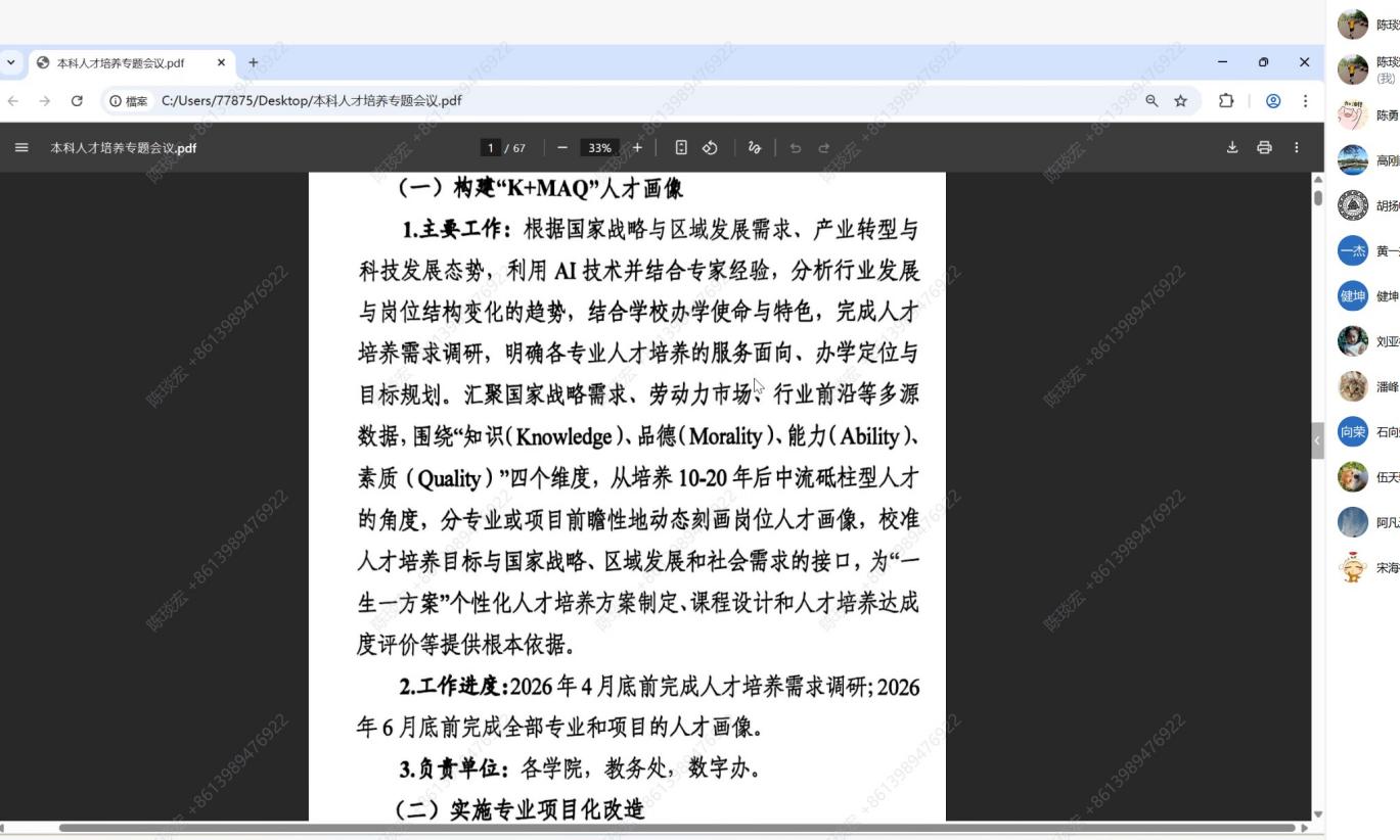 为深入贯彻落实学校本科人才培养专题会议精神,精准把握“加快构建‘一生一方案’新培养体系,着力造就‘K+ MAQ’中流砥柱型人才”的会议核心要求,切实将全校本科教育高质量发展共识转化为系部育人实践,1月26日,人工智能系组织开展了本科人才培养专题学习会议,在线系统学习了学校本科人才培养专题会议精神。