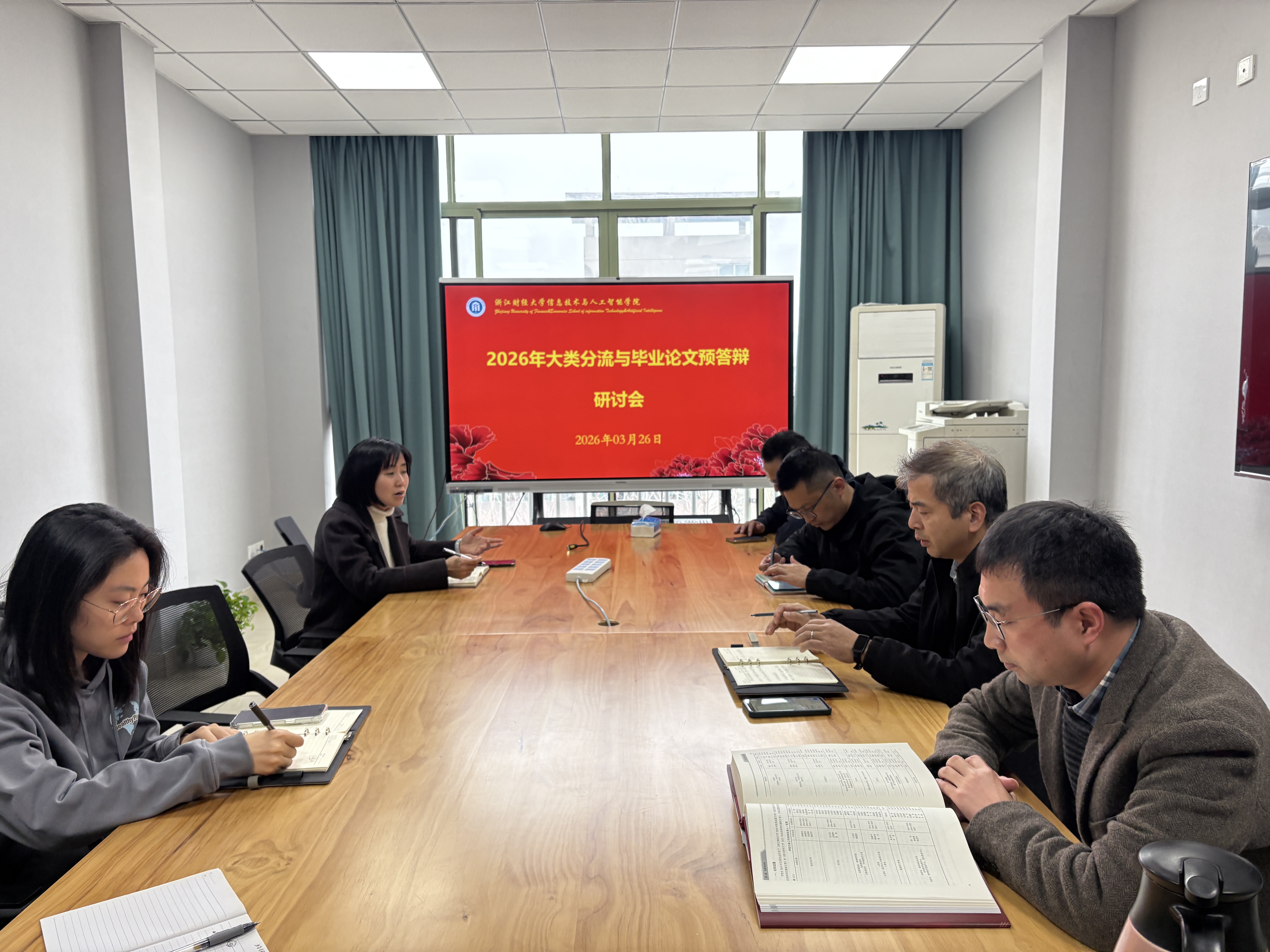 3月26日下午,我院在9506召开2026年大类分流与毕业论文预答辩专项研讨会。会议由教学院长朱凌主持,计算机科学与技术系主任陈明晶、人工智能系主任陈琰宏、软件工程系主任涂乐、实验中心副主任姜海银,以及教学秘书孙山、徐乐共同参会。
